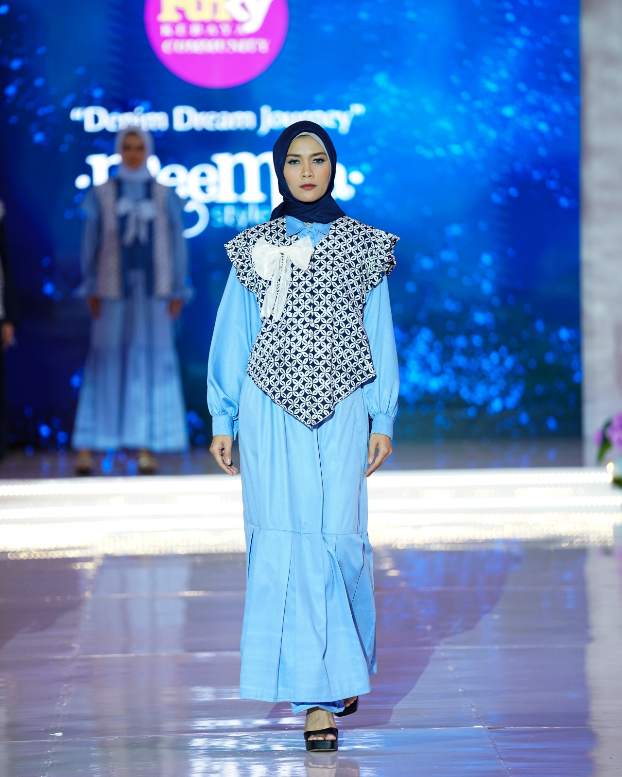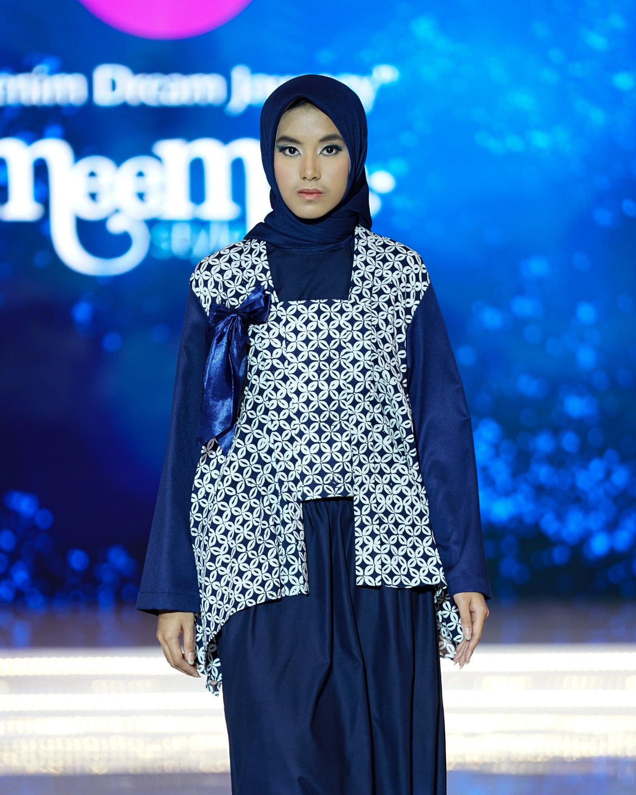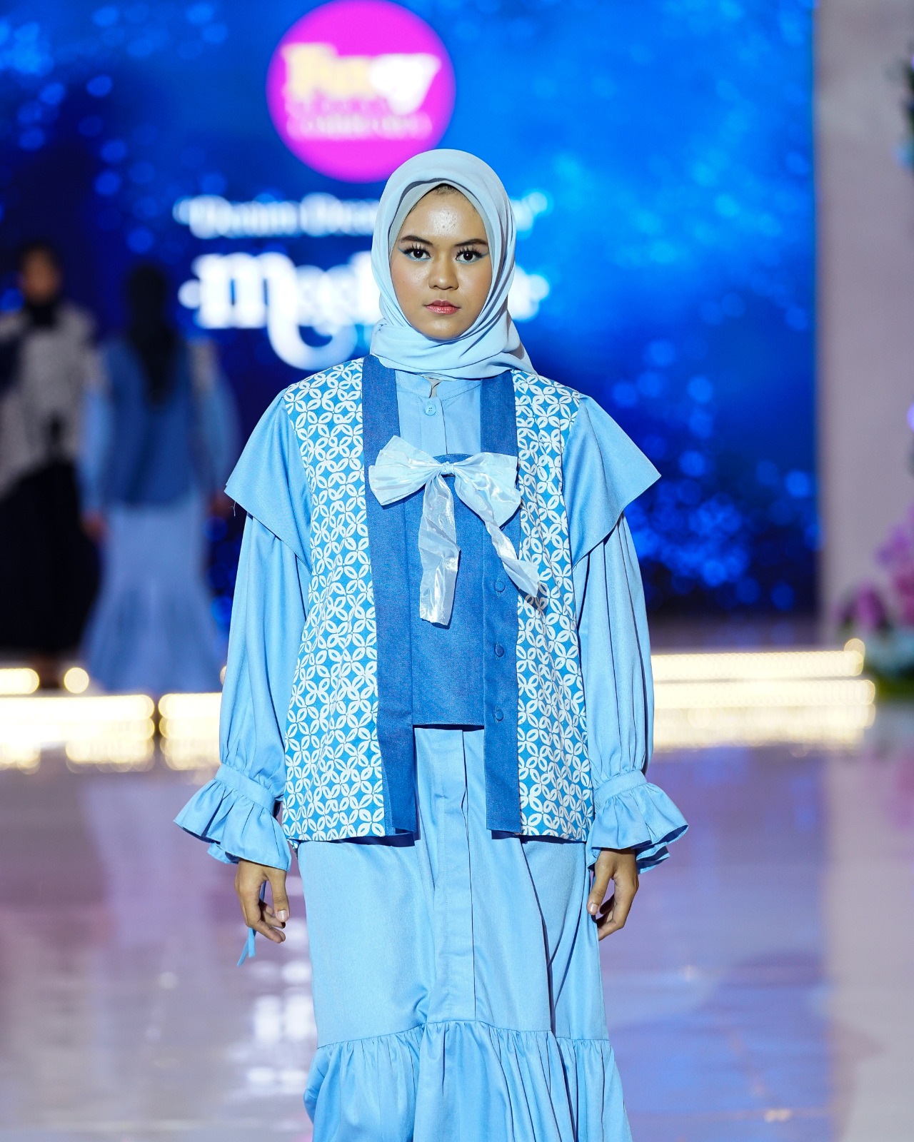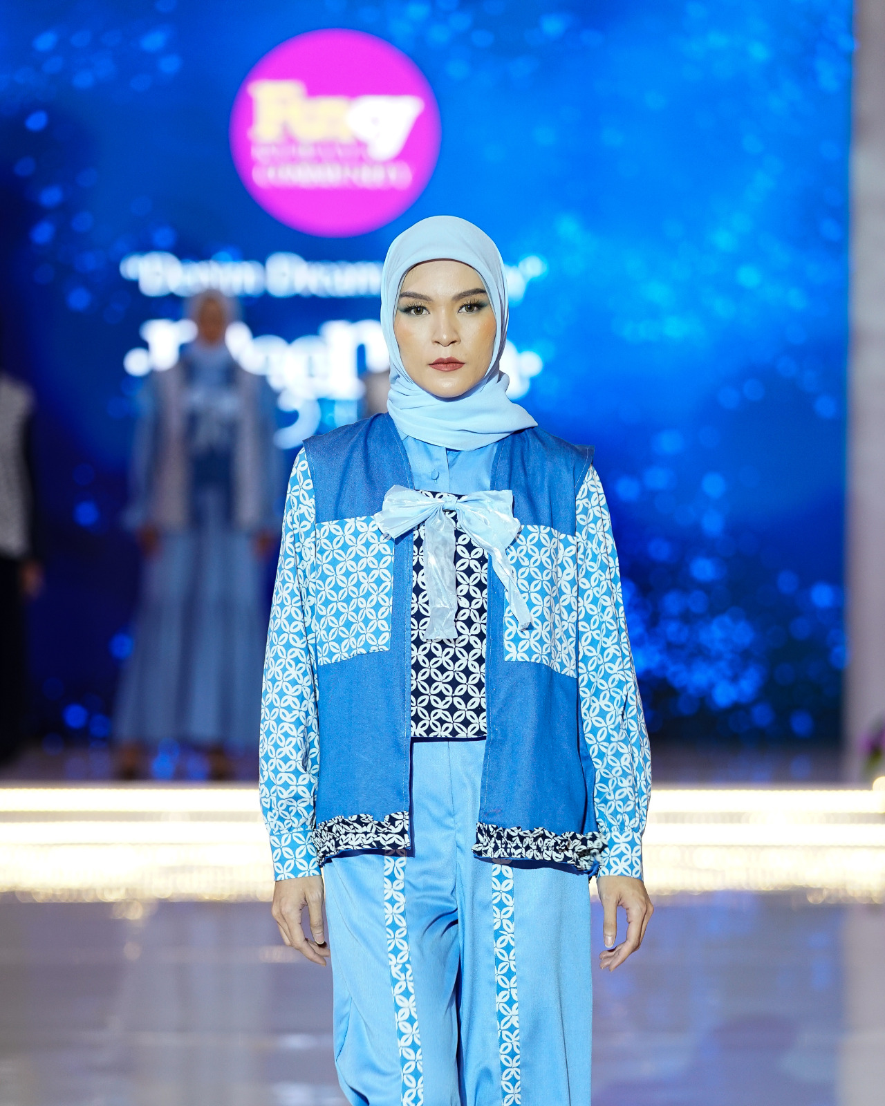 Rancangan menghadirkan potongan kutubaru modern dengan teknik layering, dikombinasikan dengan kain polos dan batik Kawung. Detail seperti aksen ruffle, potongan asimetris, dan tailoring clean menambahkan kesan dinamis, sementara siluet A dan H memberikan tampilan flowing yang nyaman dan tetap sopan untuk gaya modest.